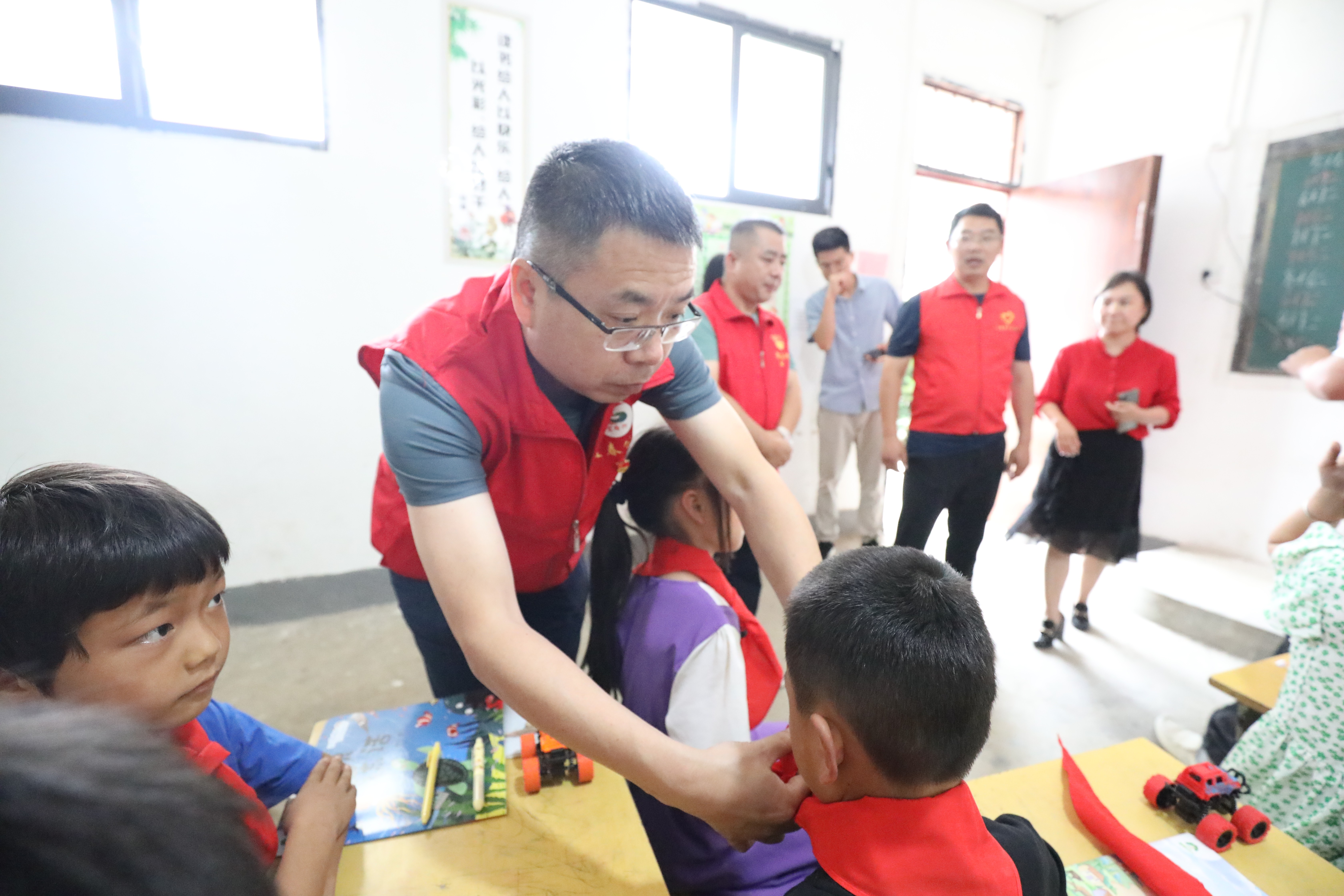 上午十點(diǎn)半許到達(dá)周源村后,志愿者一行在村干部的帶領(lǐng)下,首先來(lái)到白竹小學(xué)。走進(jìn)教室,志愿者代表首先給學(xué)生們上了一堂生動(dòng)的“防溺水”安全知識(shí)教育課,接著志愿者們給全校共13名學(xué)生贈(zèng)送了課外書(shū)刊、字帖、筆、玩具、大禮包等。彭家遠(yuǎn)、韓曉明還親切帶頭為孩子們系上了鮮艷的紅領(lǐng)巾,并給他們送上節(jié)日的祝福,鼓勵(lì)他們要樂(lè)觀開(kāi)朗、好好學(xué)習(xí),努力克服學(xué)習(xí)和生活中遇到的困難和挫折,爭(zhēng)取取得好成績(jī),走出大山,成為國(guó)家的棟梁。接著,志愿者一行來(lái)到明德小學(xué),在學(xué)校操場(chǎng)上為全校共67名學(xué)生送上了課外書(shū)刊、字帖、筆等,并為成績(jī)優(yōu)異及留守兒童送上大禮包。